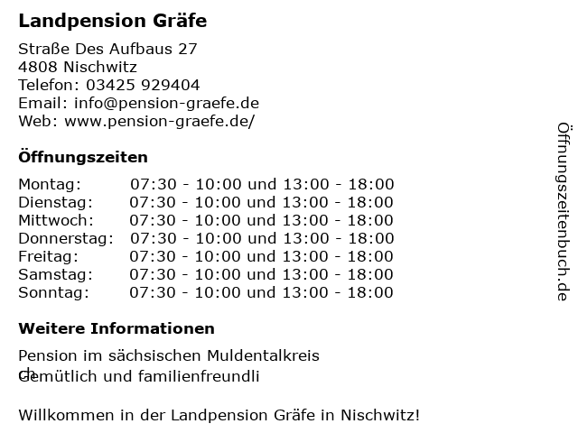 | Öffnungszeiten Landpension Gräfe in Nischwitz anzeigen | |