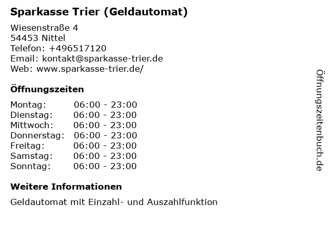 | Öffnungszeiten Sparkasse Trier (Geldautomat) in Nittel anzeigen | |