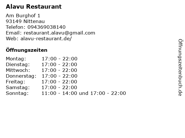 | Öffnungszeiten Alavu Restaurant in Nittenau anzeigen | |