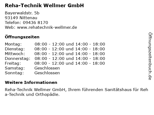 | Öffnungszeiten Reha-Technik Wellmer GmbH in Nittenau anzeigen | |