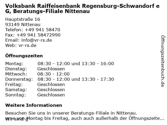 Branchen & Suchbegriffe zu Volksbank Raiffeisenbank Regensburg-Schwandorf eG, Beratungs-Filiale Nittenau:absicherung, altersvorsorge, bank, banking, baufinanzierung, beratungs, brokerage, eg, finanzberatung, geldanlage, geldautomat, girokonto, immobilien, immobilienfinanzierung, immobilienvermittlung, kredit, kreditkarte, raiffeisenbank, vermögensbildung, versicherungen, volksbank |
