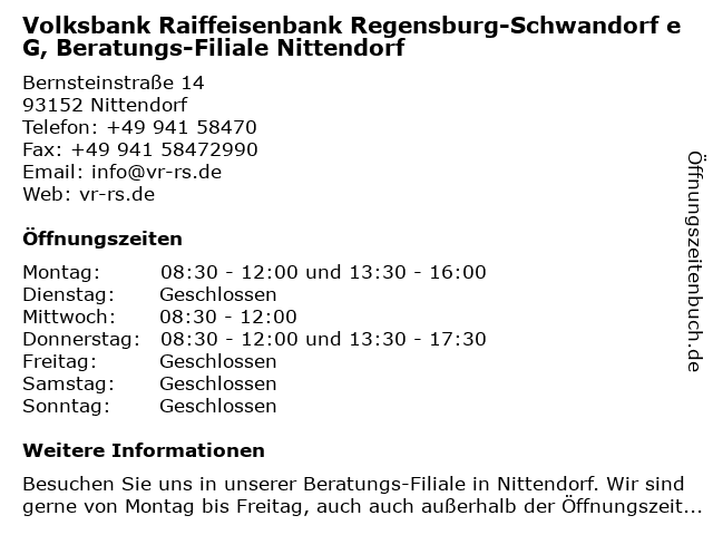 Branchen & Suchbegriffe zu Volksbank Raiffeisenbank Regensburg-Schwandorf eG, Beratungs-Filiale Nittendorf:absicherung, altersvorsorge, bank, banking, baufinanzierung, beratungs, brokerage, eg, finanzberatung, finanzen, geldanalge, geldautomat, girokonto, immobilien, immobilienfinanzierung, immobilienvermittlung, kredit, kreditkarte, nittendorf, raiffeisenbank, vermögensbildung, versicherungen, volksbank, vorsorge |