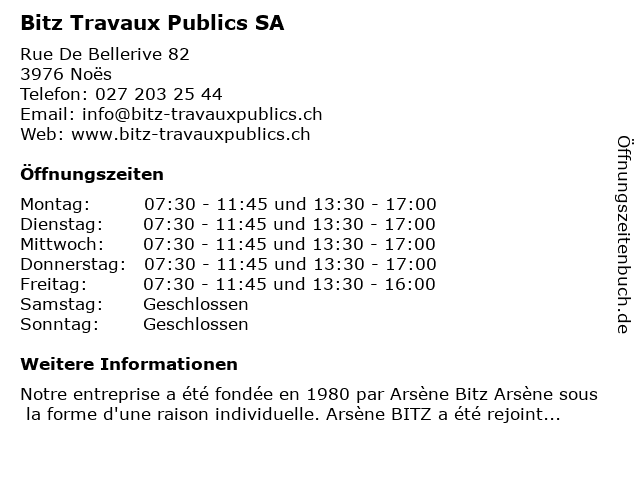 | Öffnungszeiten Bitz Travaux Publics SA in Noës anzeigen | |