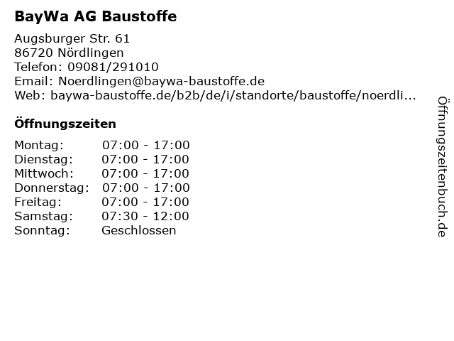 | Öffnungszeiten BayWa AG Baustoffe in Nördlingen anzeigen | |
