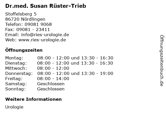 | Öffnungszeiten Dr.med. Susan Rüster-Trieb in Nördlingen anzeigen | |