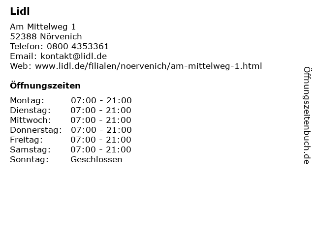 | Öffnungszeiten Lidl in Nörvenich anzeigen | |