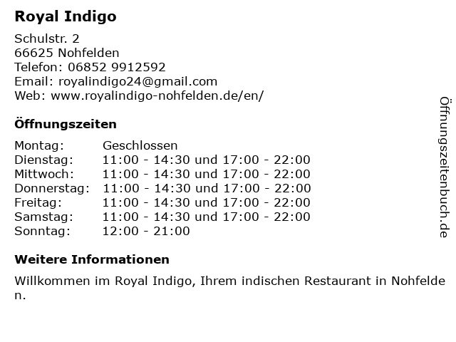 | Öffnungszeiten Royal Indigo in Nohfelden anzeigen | |