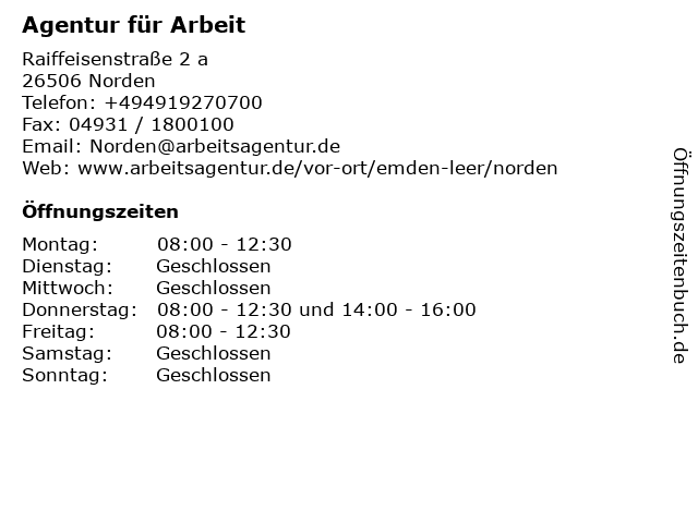 | Öffnungszeiten Agentur für Arbeit in Norden anzeigen | |