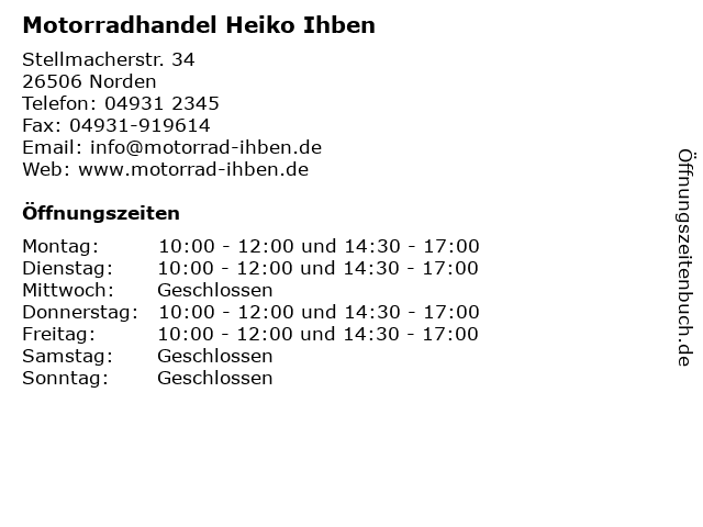 | Öffnungszeiten Motorradhandel Heiko Ihben in Norden anzeigen | |