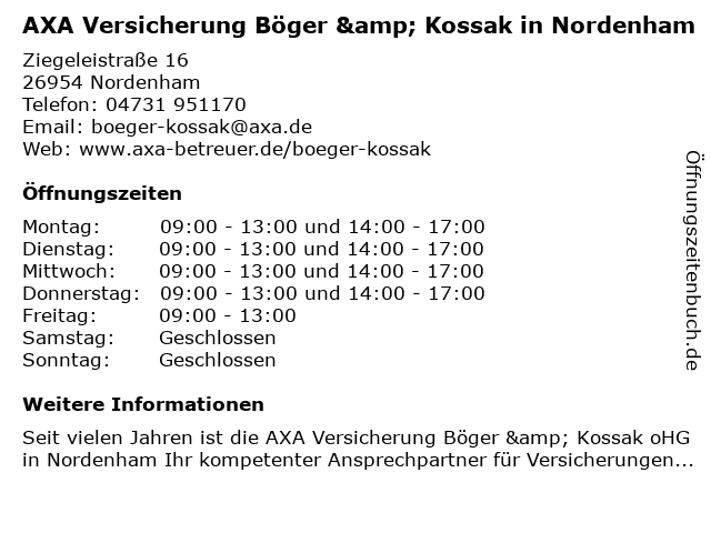 2 AXA Versicherung - Bezirksvertretung Rene Russell (Entfernung: 3,28 km) Fischkai 57, 27572 Bremerhaven 3 DBV Deutsche Beamtenversicherung Böger & Kossak in Bremerhaven (Entfernung: 3,52 km) Barkhausenstraße 26e, 27568 Bremerhaven 6 |