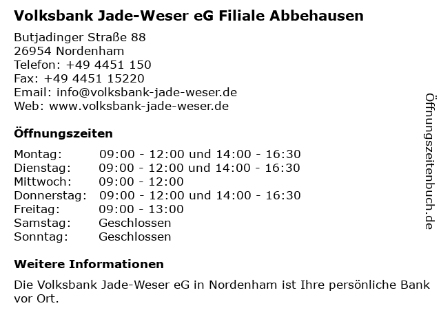 Branchen & Suchbegriffe zu Volksbank Jade-Weser eG Filiale Abbehausen:abbehausen, altersvorsorge, bank, baufinanzierung, eg, geldanlage, geldautomat, girokonto, immobilien, jade, kredit, kreditkarte, versicherung, volksbank, weser |