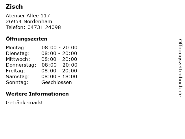 | Öffnungszeiten Zisch in Nordenham anzeigen | |