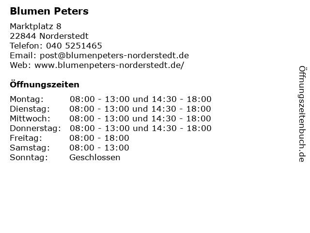 | Öffnungszeiten Blumen Peters in Norderstedt anzeigen | |