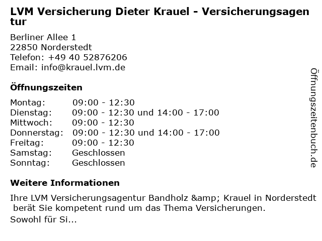 1 LVM-Versicherungsagentur Bandholz und Krauel GbR (Entfernung: 0,00 km) Berliner Allee 1, 22850 Norderstedt 6 |