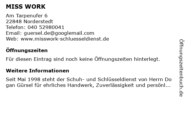 | Öffnungszeiten MISS WORK in Norderstedt anzeigen | |