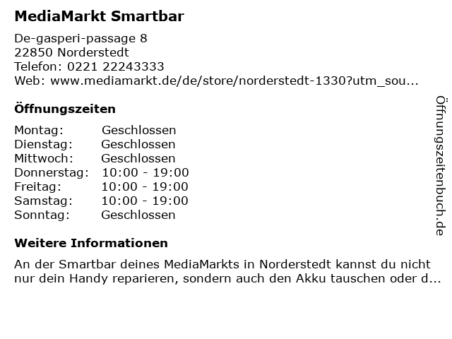| Öffnungszeiten MediaMarkt Smartbar in Norderstedt anzeigen | |
