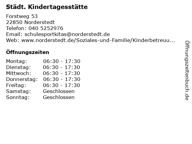 | Öffnungszeiten Städt. Kindertagesstätte in Norderstedt anzeigen | |