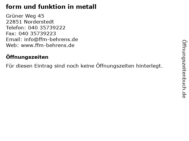 1 Form und Funktion in Metall Thorsten Behrens Metallbau (Entfernung: 0,24 km) Grüner Weg 45, 22851 Norderstedt 2 IMH Indutec Metall Handelsgesellschaft mbH (Entfernung: 7,73 km) Ohlendorffs Tannen 36, 22359 Hamburg 4 6 |