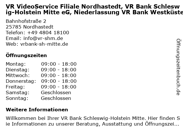 Branchen & Suchbegriffe zu VR VideoService Filiale Nordhastedt, VR Bank Schleswig-Holstein Mitte eG, Niederlassung VR Bank Westküste:bank, eg, holstein, mitte, niederlassung, nordhastedt, videoservice, vr, westküste |