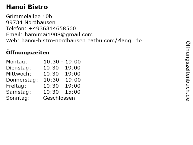 | Öffnungszeiten Hanoi Bistro in Nordhausen anzeigen | |