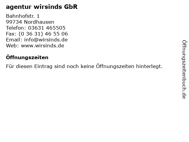 | Öffnungszeiten agentur wirsinds GbR in Nordhausen anzeigen | |