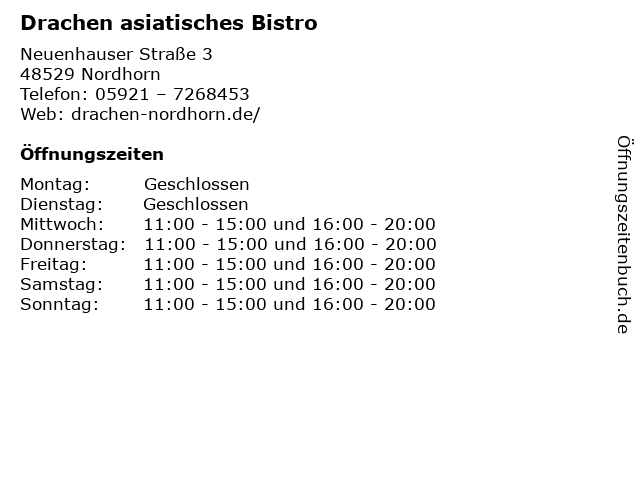 | Öffnungszeiten Drachen asiatisches Bistro in Nordhorn anzeigen | |