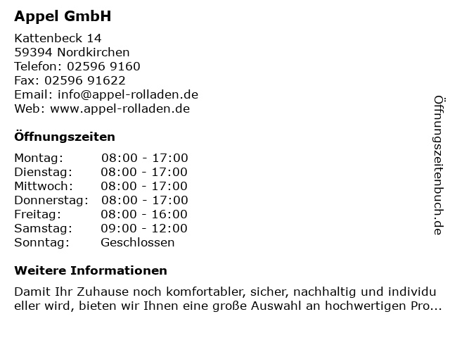| Öffnungszeiten Appel GmbH in Nordkirchen anzeigen | |