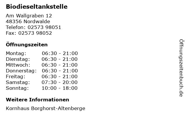 | Öffnungszeiten Biodieseltankstelle in Nordwalde anzeigen | |