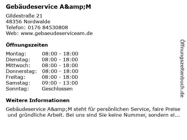 | Öffnungszeiten Gebäudeservice A&M in Nordwalde anzeigen | |