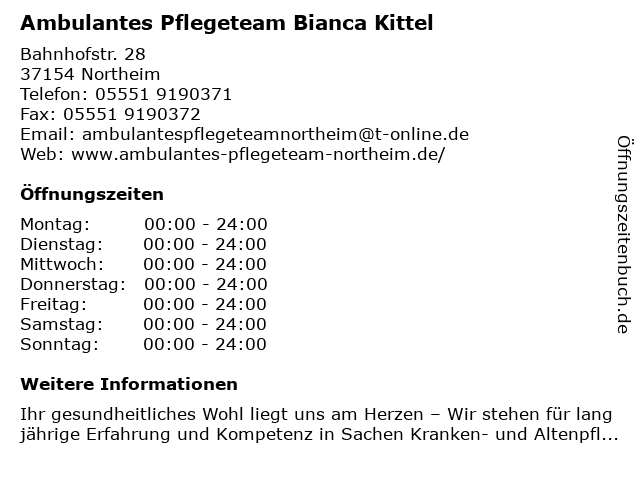 1 Pflegeteam Schunke GmbH - Bürozeiten (Entfernung: 11,07 km) Hinter der Kirche 31, 37520 Osterode am Harz 6 |