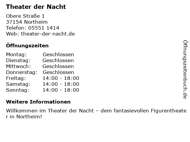 | Öffnungszeiten Theater der Nacht in Northeim anzeigen | |