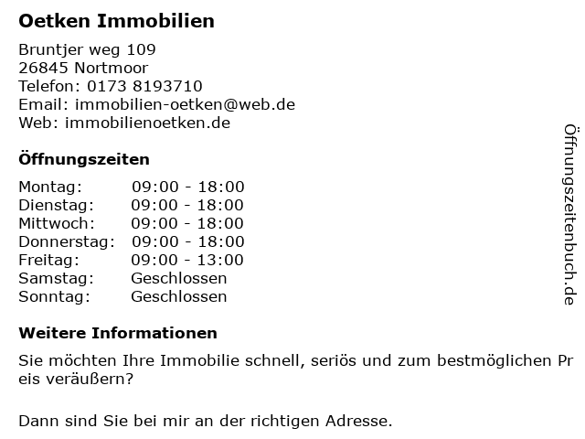 | Öffnungszeiten Oetken Immobilien in Nortmoor anzeigen | |