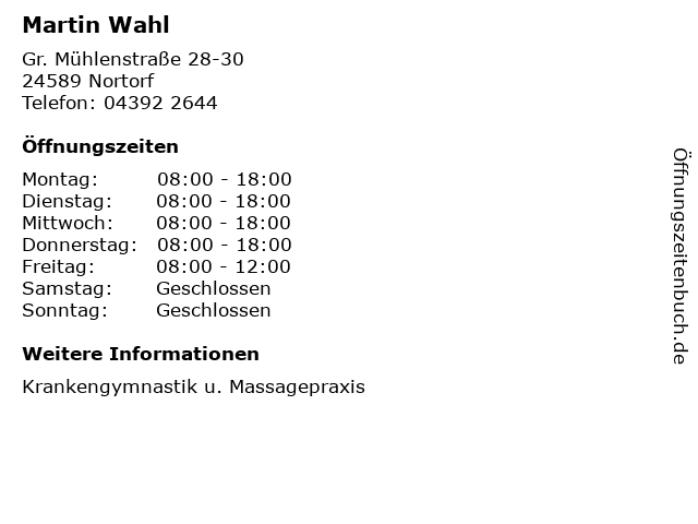 | Öffnungszeiten Martin Wahl in Nortorf anzeigen | |