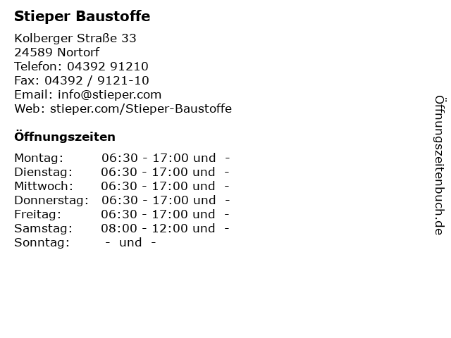 | Öffnungszeiten Stieper Baustoffe in Nortorf anzeigen | |