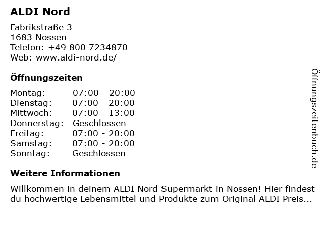| Öffnungszeiten ALDI Nord in Nossen anzeigen | |