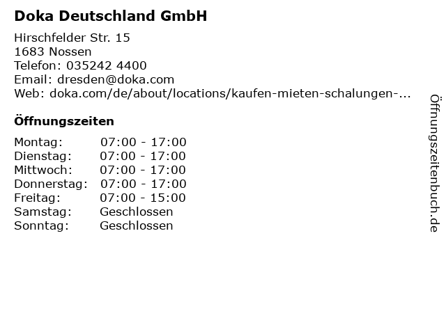 | Öffnungszeiten Doka Deutschland GmbH in Nossen anzeigen | |
