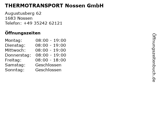 | Öffnungszeiten THERMOTRANSPORT Nossen GmbH in Nossen anzeigen | |