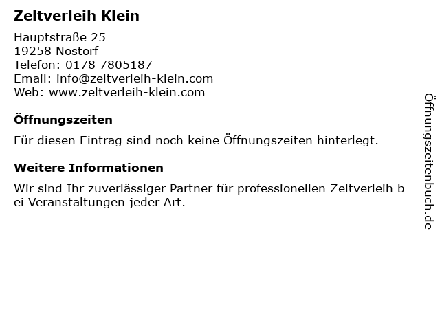 | Öffnungszeiten Zeltverleih Klein in Nostorf anzeigen | |