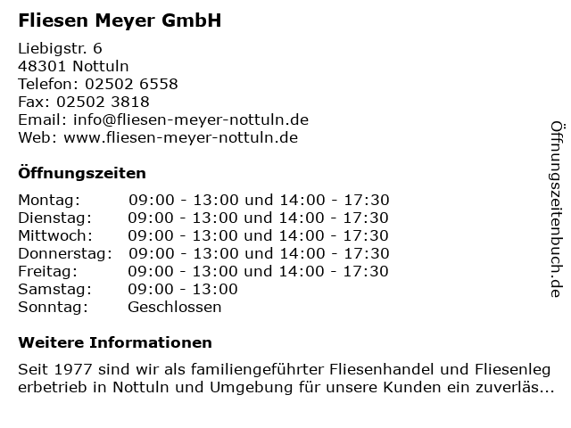 | Öffnungszeiten Fliesen Meyer GmbH in Nottuln anzeigen | |