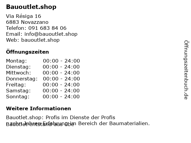 | Öffnungszeiten Bauoutlet.shop in Novazzano anzeigen | |