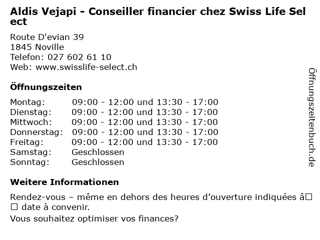 1 Luca Cherchi - Conseiller financier chez Swiss Life Select (Entfernung: 0,00 km) Route D'evian 39, 1845 Noville 2 Mikael Martins Gaspar - Cadres chez Swiss Life Select (Entfernung: 0,00 km) Route D'evian 39, 1845 Noville 3 Karim Flaction - Führungskraft bei Swiss Life Select (Entfernung: 0,00 km) Place Du Midi 21, 1950 Sion 6 Hôtel restaurant le Rivage chez Monmon (Entfernung: 8,77 km) Quai Isaac de Rivaz 4, 1898 Saint-Gingolph  |