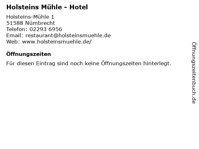 | Öffnungszeiten Holsteins Mühle - Hotel in Nümbrecht anzeigen | |