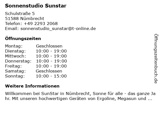 | Öffnungszeiten Sonnenstudio Sunstar in Nümbrecht anzeigen | |