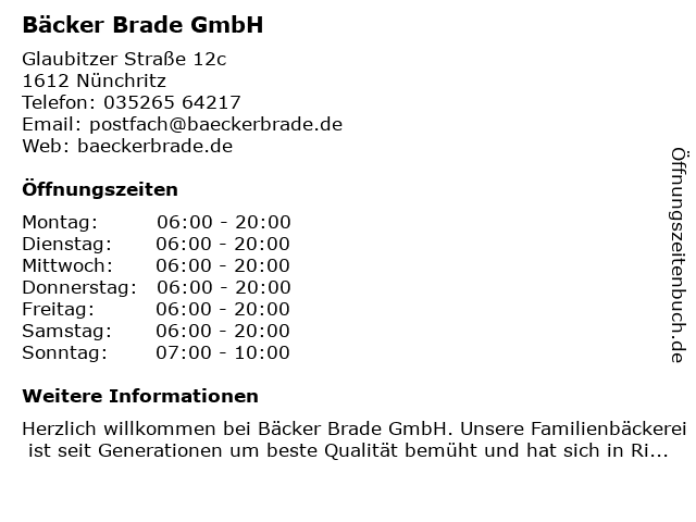 | Öffnungszeiten Bäcker Brade GmbH in Nünchritz anzeigen | |