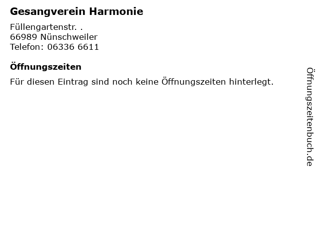 | Öffnungszeiten Gesangverein Harmonie in Nünschweiler anzeigen | |