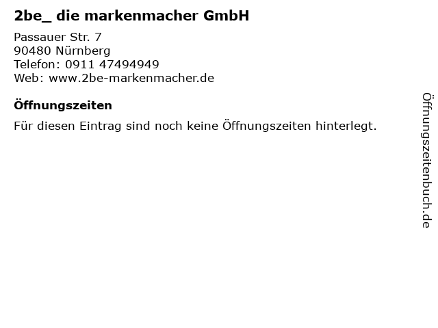 | Öffnungszeiten 2be_ die markenmacher GmbH in Nürnberg anzeigen | |