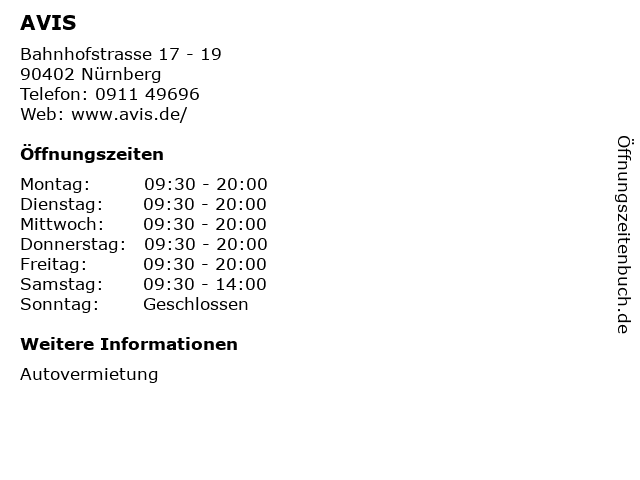 | Öffnungszeiten AVIS in Nürnberg anzeigen | |