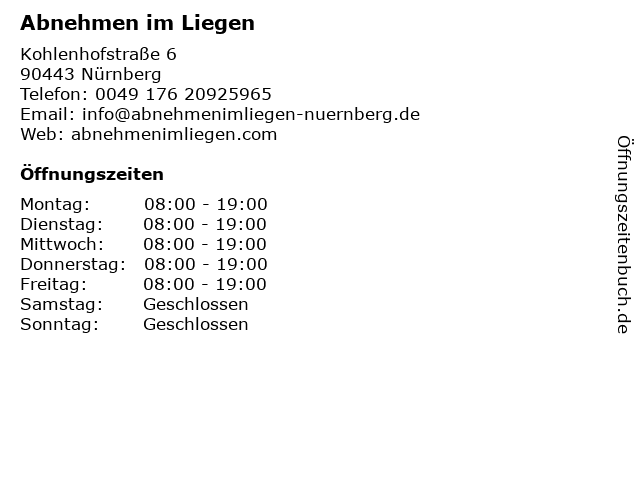| Öffnungszeiten Abnehmen im Liegen in Nürnberg anzeigen | |