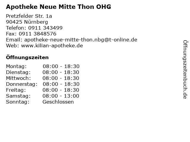 | Öffnungszeiten Apotheke Neue Mitte Thon OHG in Nürnberg anzeigen | |
