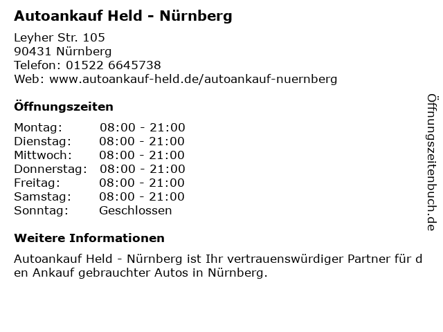 | Öffnungszeiten Autoankauf Held - Nürnberg in Nürnberg anzeigen | |